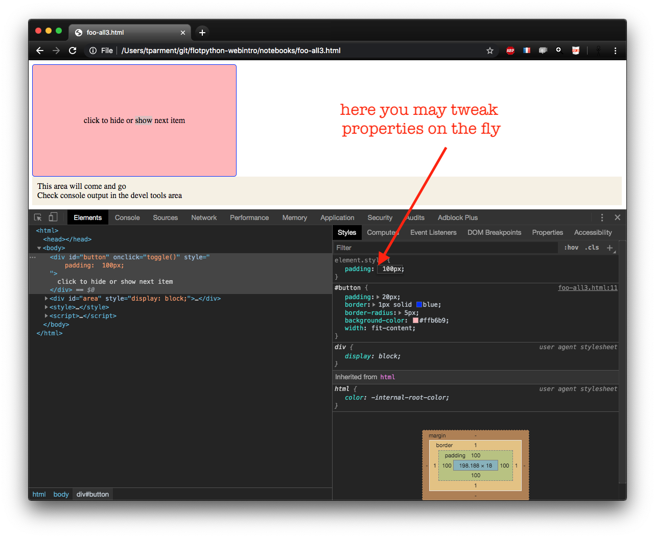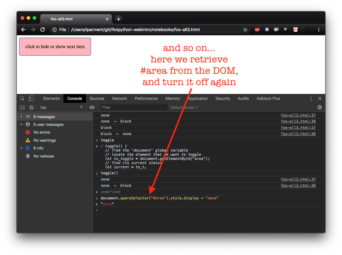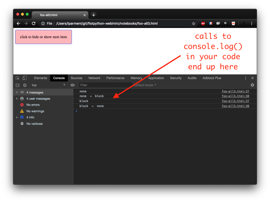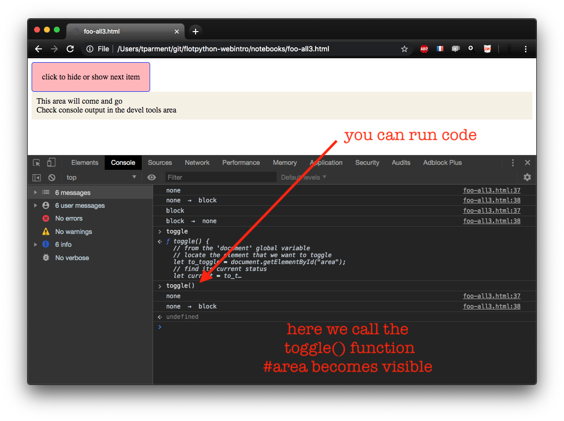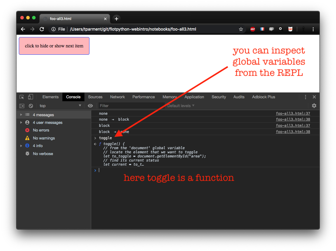 console.logof course quite useful for naive debuggingand that lets you run JavaScript on the fly much like the Python interpreter does