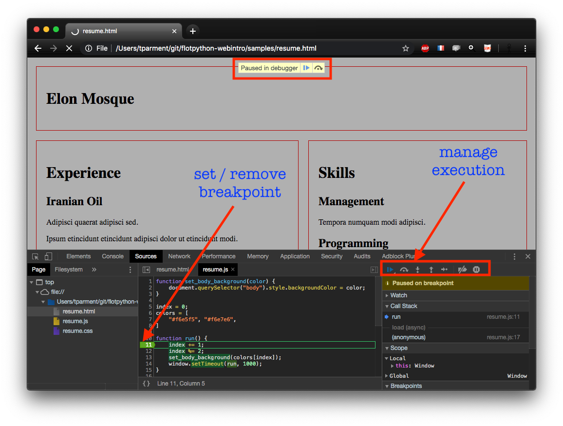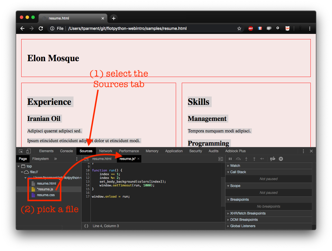 the Sources tab has buit-in debugging features
